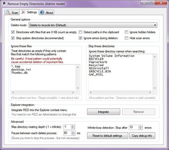 Enfin, Remove Empty Directory Portable s'intègre à l'explorateur de fichier et autorise la création de règles pour personnaliser le nettoyage des dossiers inutiles contenant des fichiers temporaires. Vous pouvez aussi dresser une liste des dossiers à exclure des scans (corbeille, dossiers système, etc.)